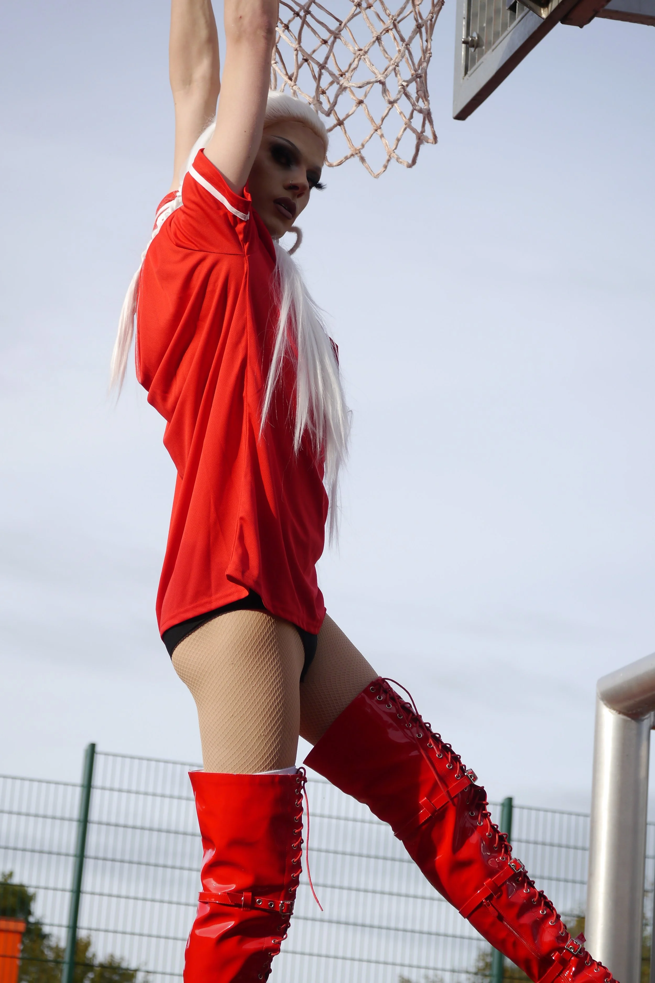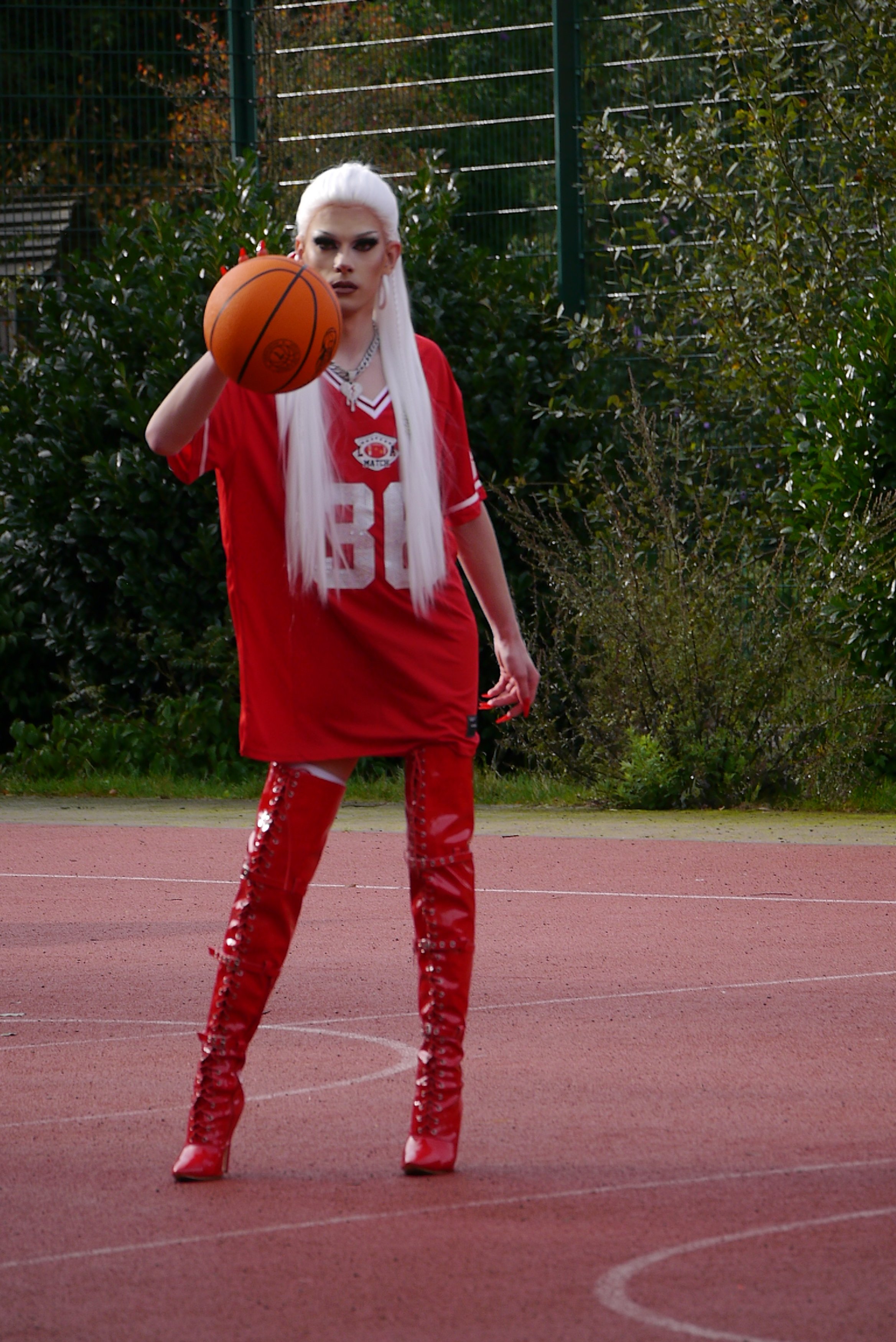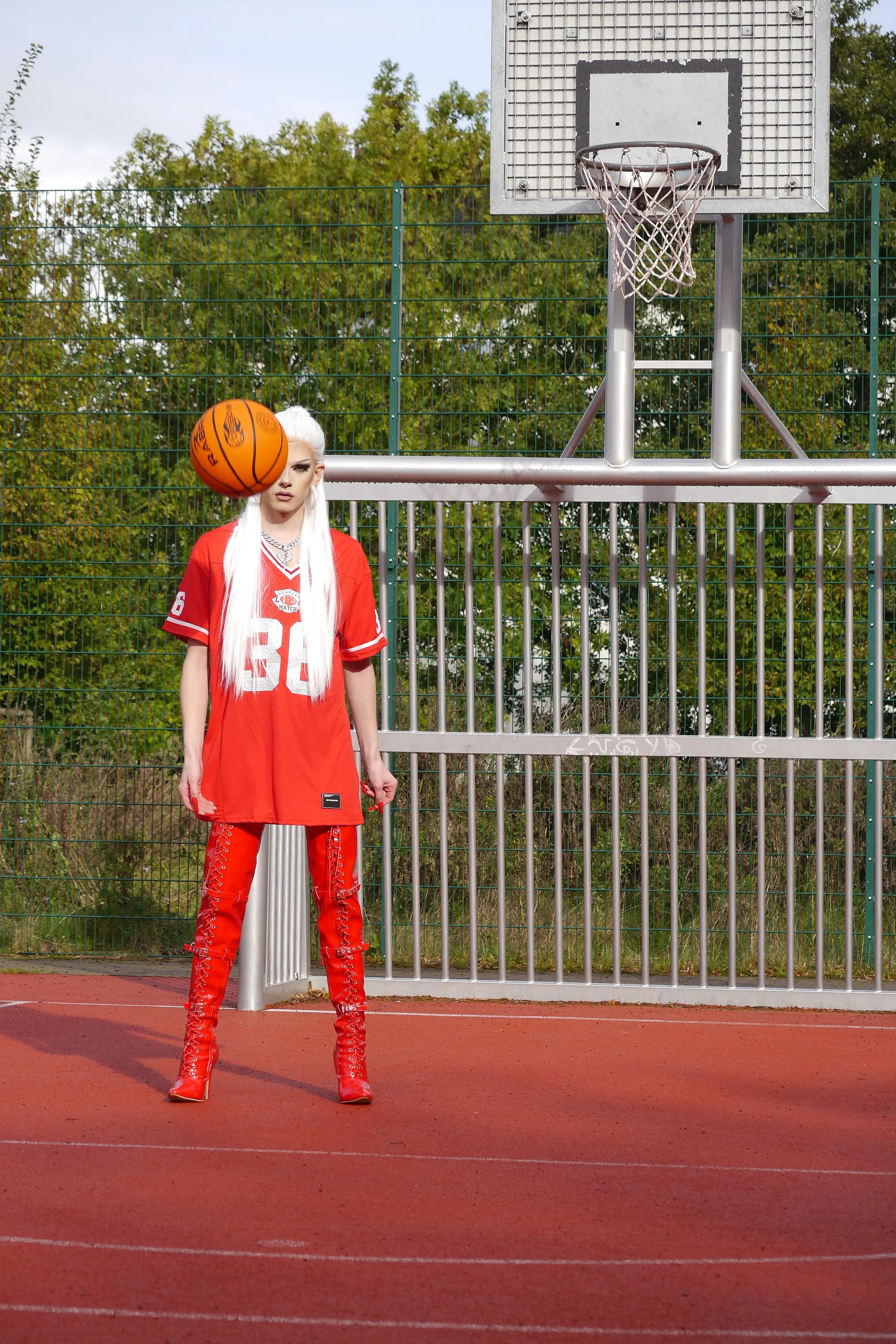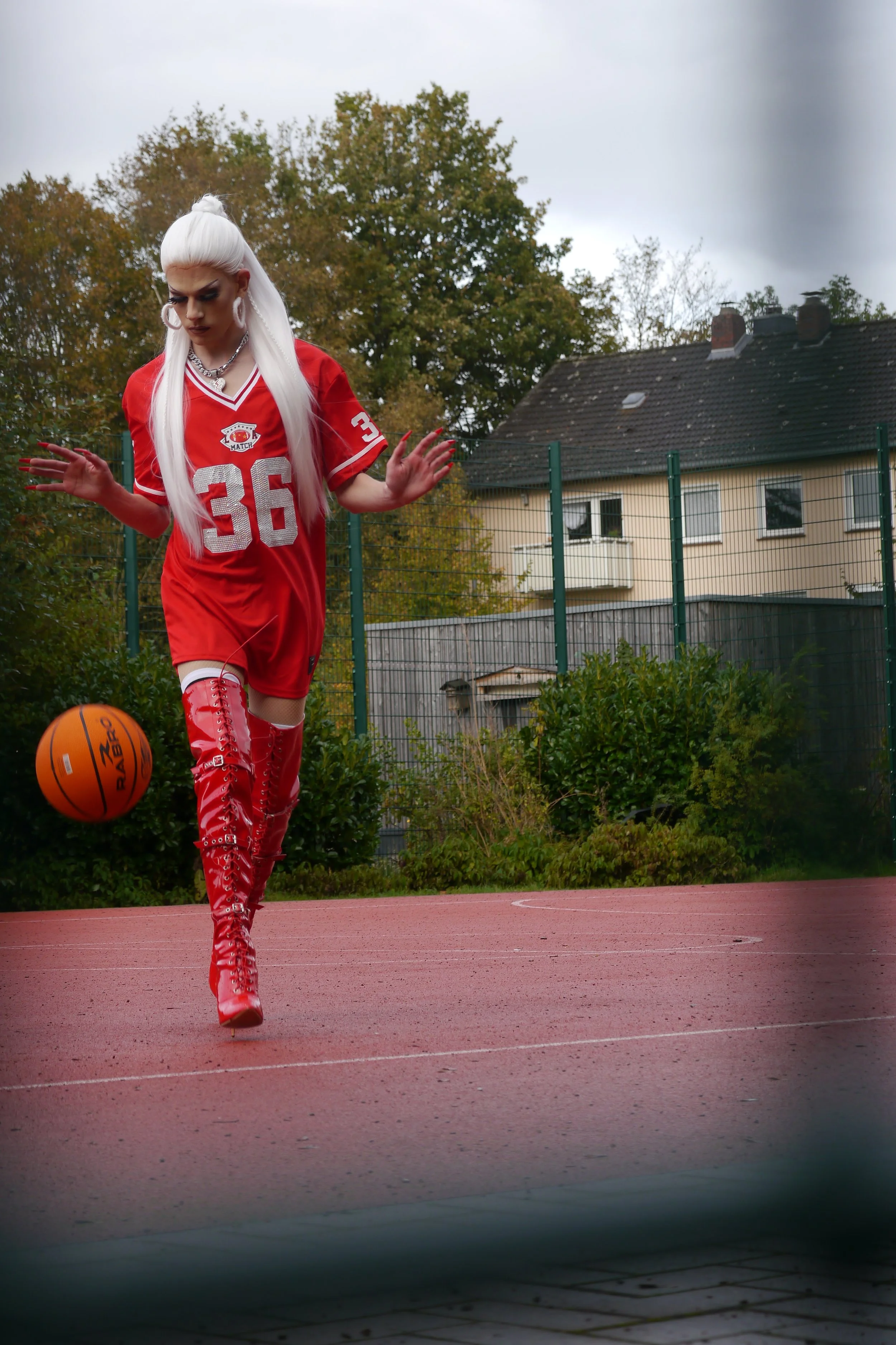 Die Inspiration für dieses Shooting kam von Sportwerbungen aus den 90er Jahren, die das ikonische Bild des Hinterhof-Basketballfeldes in der Stadt zeigen. Wir wollten, dass die satten Rottöne richtig zur Geltung kommen, und haben uns für einen monochromen Stil entschieden. Aufgenommen auf 35-mm-Film und digital.